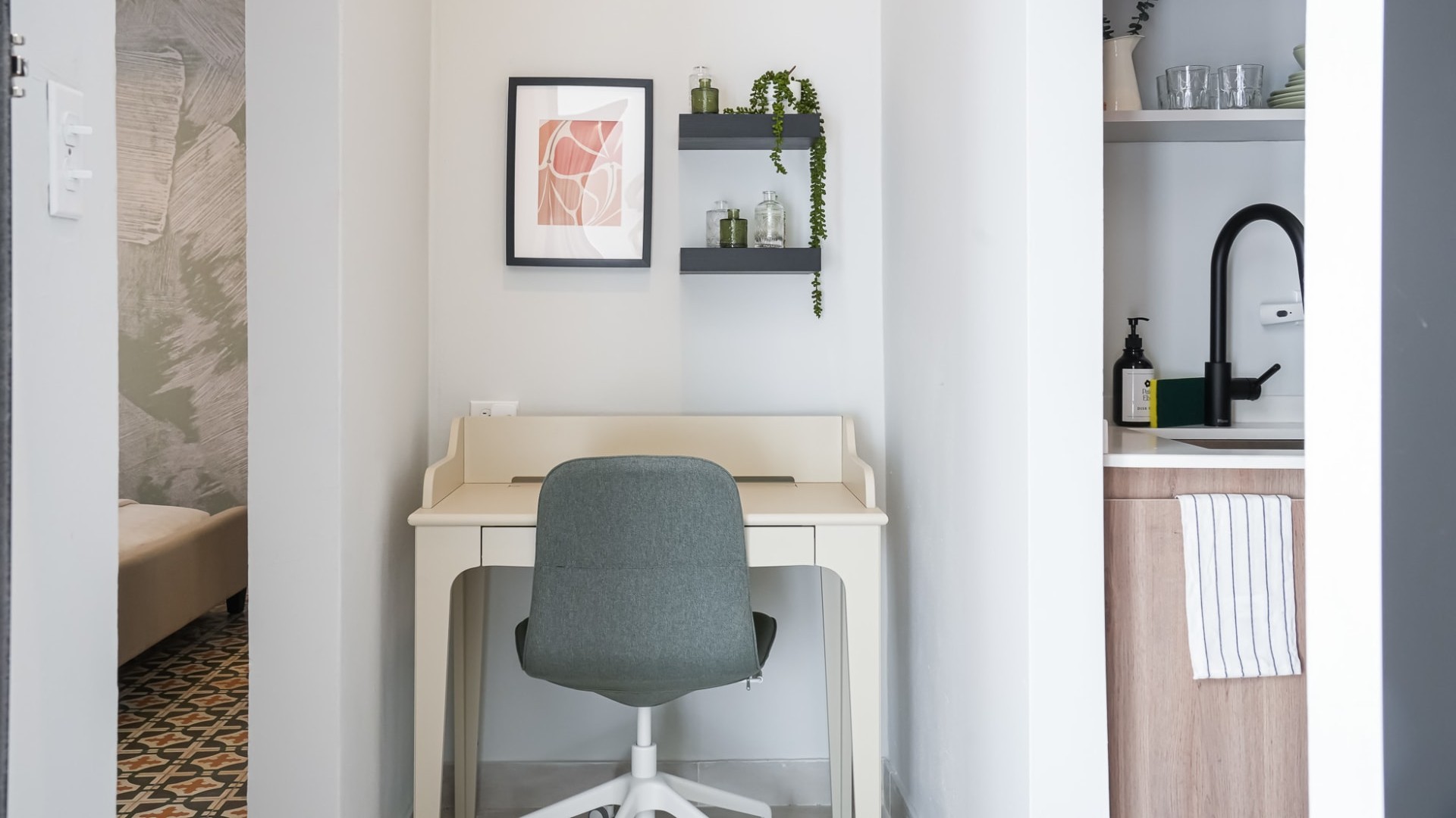 Elementos patrimoniales definen la distribución de esta habitación, donde una cama de matrimonio, un escritorio y toques modernos se integran armoniosamente con la arquitectura original. Una combinación ideal para viajeros que aprecian un ambiente tranquilo con un carácter auténtico.
